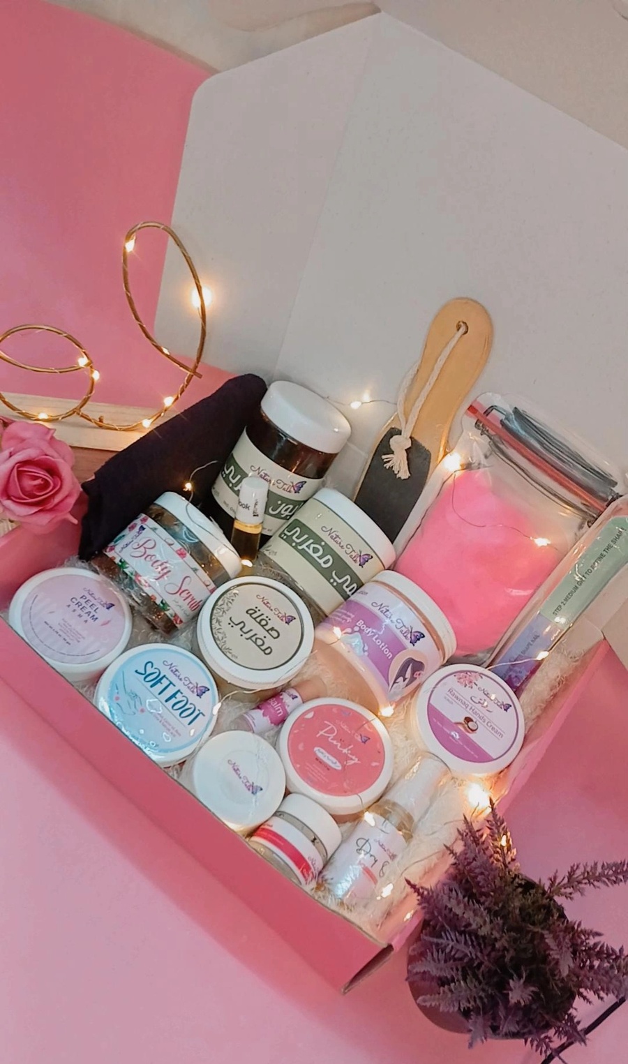 للجسم: حمام مغربي، بادي سكراب، بادي لوشن، ودراي أويل للمعة مخملية.