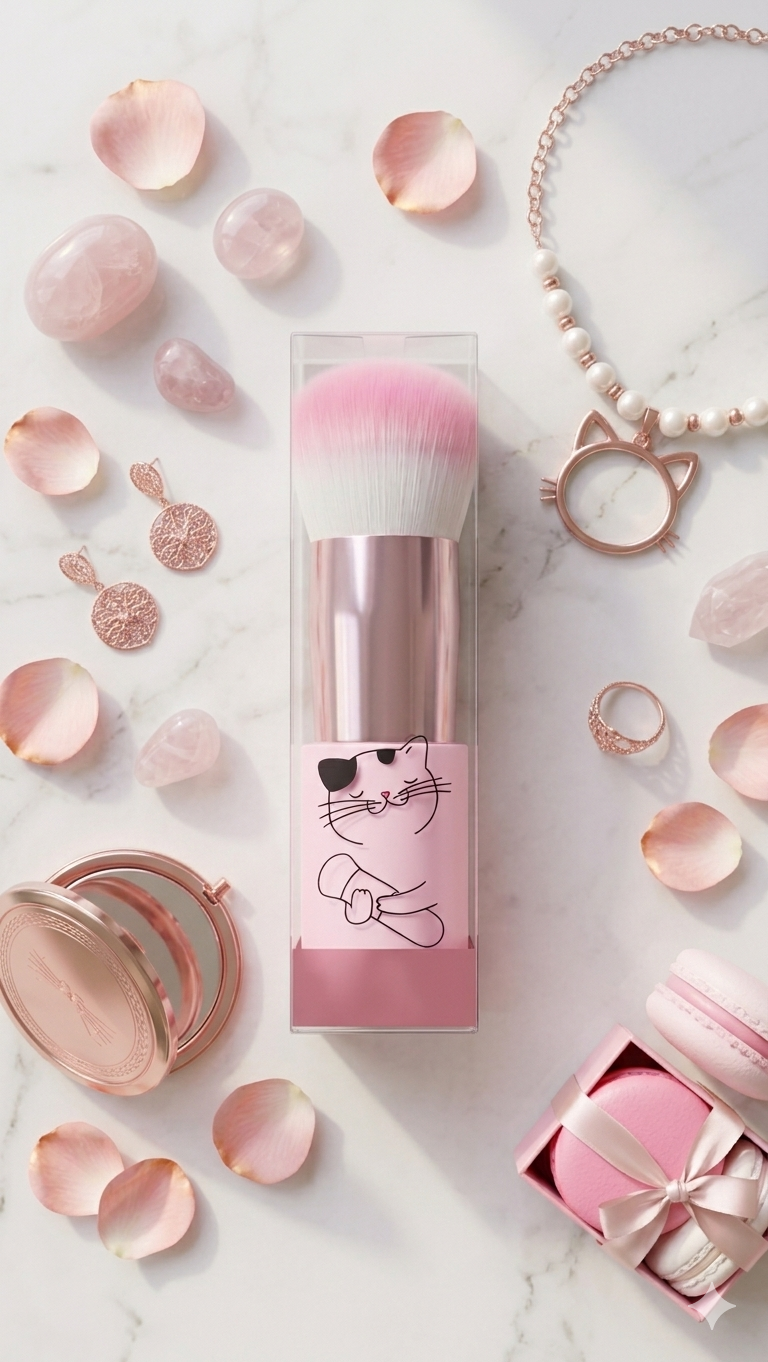 جددي مجموعة مكياجك مع الفرشاة الأكثر لطفاً ونعومة! صُممت هذه الفرشاة لتمنحكِ توزيعاً مثالياً للبلاشر (أحمر الخدود) أو البودرة، مع تصميم وردي برسمة قطة يضيف لمسة من السعادة لطاولتك.