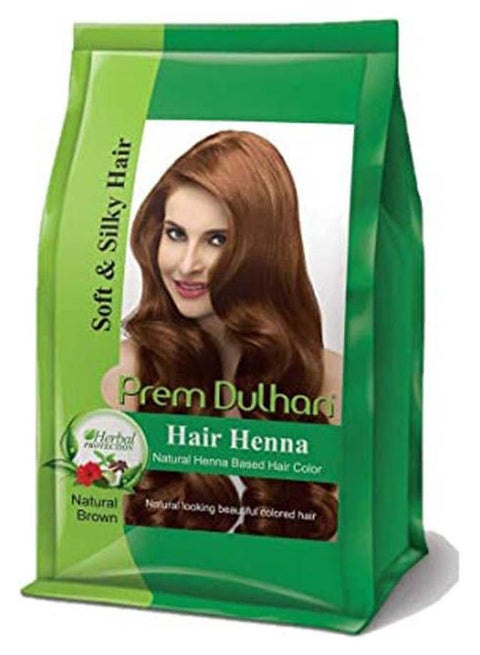حنة بريم دولهان (Prem Dulhan) الهندية هي صبغة شعر طبيعية 100% غنية بـ 9 أعشاب هندية مثل الأملا والشيكاكاي، تمنح الشعر لوناً بنياً غامقاً طبيعياً وتغطي الشيب من أول مرة. تعمل على تغذية الشعر، علاج التساقط، زيادة النعومة، وهي خالية من الأمونيا ومناسبة لجميع انواع الشعر