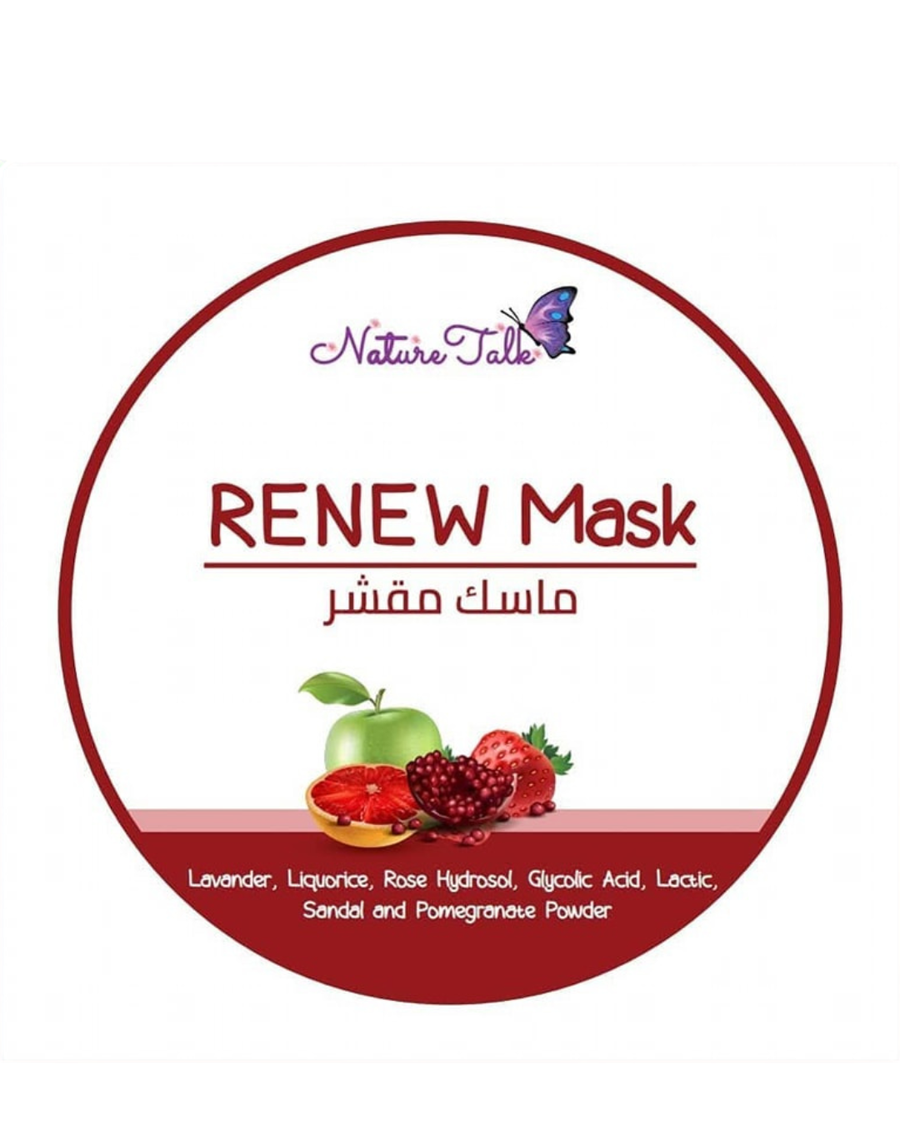 جددي شباب بشرتك مع Renew Mask. بتركيبة أحماض الجليكوليك، اللاكتيك، والساليسيليك لتقشير لطيف، تنظيف المسام، وعلاج الخطوط الرفيعة. احصلي على ملمس ناعم بدون قشور!
